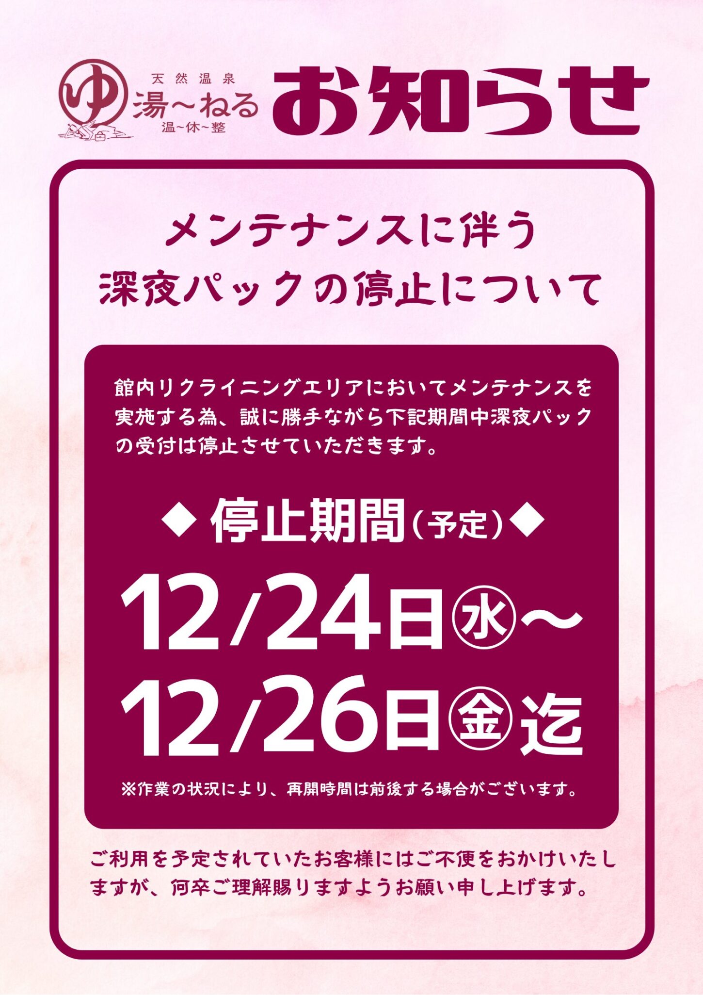 3. メンテナンスに伴う深夜パック停止のお知らせ