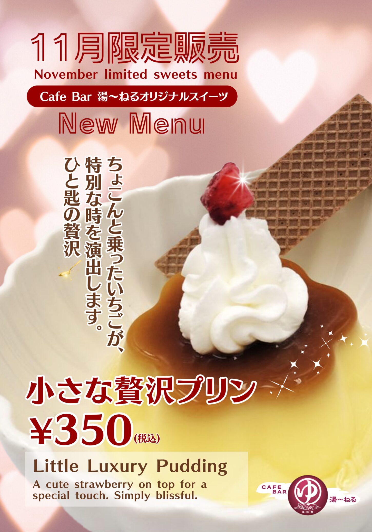 11月新メニュースイーツ 2025.10.31 毎月恒例のcafe bar湯~ねるの新メニュースイーツ「小さな贅沢プリン」をご紹介! ちょこんと乗ったいちごが、特別な時を演出します。ひと匙の贅沢🥄♪ ぜひこの機会にご賞味ください!